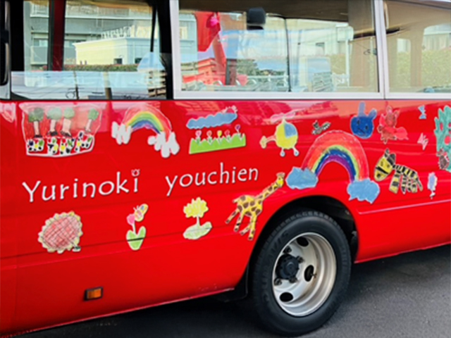 子ども達が描いたイラストでラッピングされた世界にひとつだけのバスで園児を迎えに行きます。