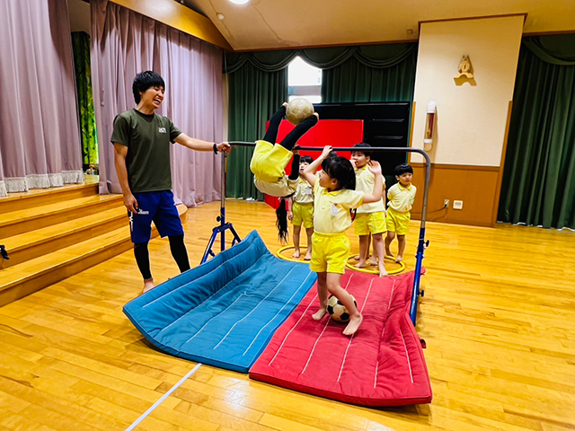 縄跳びや鉄棒、マット運動、柔軟体操、ドッジボールなどを、日々の保育と連携して取り入れ、楽しみながら体を動かせる環境を大切にしています。