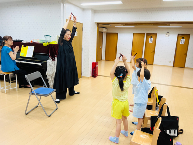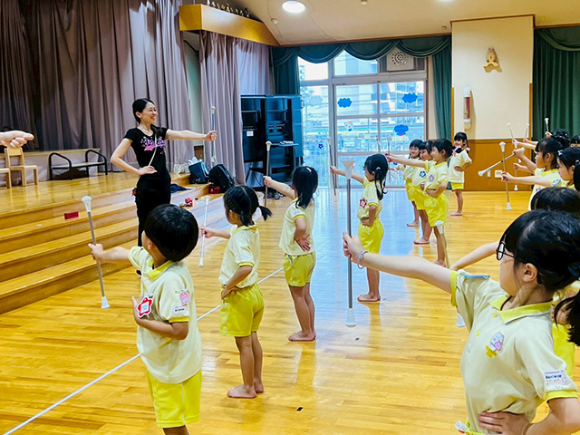 バトンを使った練習で、手先の器用さや集中力を育み、音楽に合わせてダンスの基礎やリズム感を身につけます。